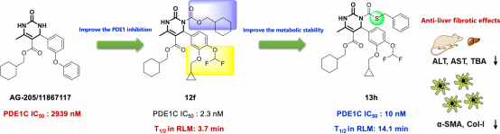 磷酸二酯酶PDE1是一个潜在的抗肝纤维化的药物作用靶标,但相关的研究较少。团队通过高通量虚拟筛选的方法发现了一个具有新型二氢嘧啶骨架的PDE1抑制剂AG-205/11867117(IC50为2939 nM),通过两轮结构优化后成功获得了一个PDE1抑制活性高(IC50为10 nM)、PDEs亚型选择性高(> 60倍)、代谢稳定性好(体外肝微粒体T1/2为14.1 min,体内代谢T1/2为7.51 h)等综合性质优良的先导结构13h,并在胆管结扎诱导的大鼠体内肺纤维化模型和TGF-β诱导的肌成纤维细胞分化细胞模型中都证实13h具有显著的抗肝纤维化药效。本研究进一步证实了PDE1是一个潜在的抗肝纤维化药物作用靶标,并为选择性PDE1抑制剂的发现提供了物质基础。