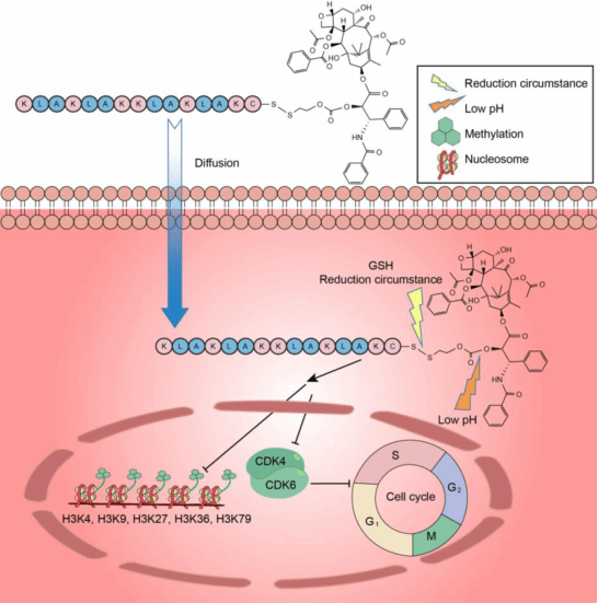 研究团队通过二硫键和酯键将PAP肽与PTX相偶联以构建PAP-SS-PTX,提高了PTX分子的水溶性和生物利用度。在肿瘤微环境中PAP-SS-PTX在微酸以及还原性双重刺激下释放活性药物分子紫杉醇(PTX),抑制细胞内CDK4/6以及组蛋白甲基化的水平,发挥抗肿瘤效果。