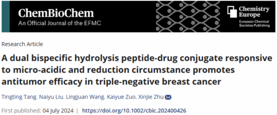 近日,海南大学李松院士工作站(药学院)的朱新杰副教授团队,在Chemistry Europe出版集团旗下的经典期刊ChemBioChem上发表了标题为“A dual bispecific hydrolysis peptide-drug conjugate responsive to micro-acidic and reduction circumstance promotes antitumor efficacy in triple-negative breast cancer”的研究论文。文中设计并构建了一种能够对肿瘤微环境(弱酸性及还原性)双特异性响应水解释药的多肽偶联药物PAP-SS-PTX,并探究其在三阴性乳腺癌治疗中的作用机制。