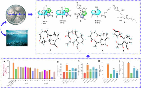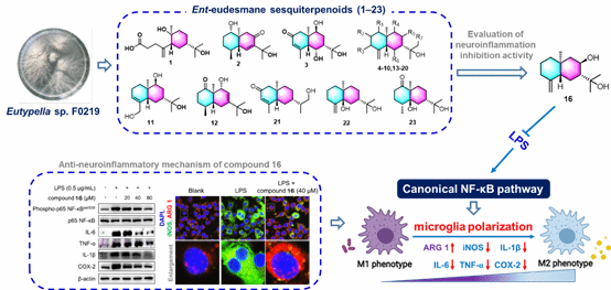 此外,团队从该真菌Eutypella sp. F0219中分离鉴定了23个的桉叶烷型倍半萜类化合物,包括15个新化合物。活性测试表明该类化合物具有抗神经炎症活性,进一步机制研究发现优选化合物16可显著降低IL-6, TNF-α,等炎症因子表达,下调iNOS,上调ARG-1,进而抑制NF-κB激活介导的小胶质细胞M1极化,发挥抗神经炎症活性。该研究为基于靶向神经炎症抗AD海洋创新药物研发提供了分子模版和骨架参考(Phytochemistry,2024年,223卷,114121页)。