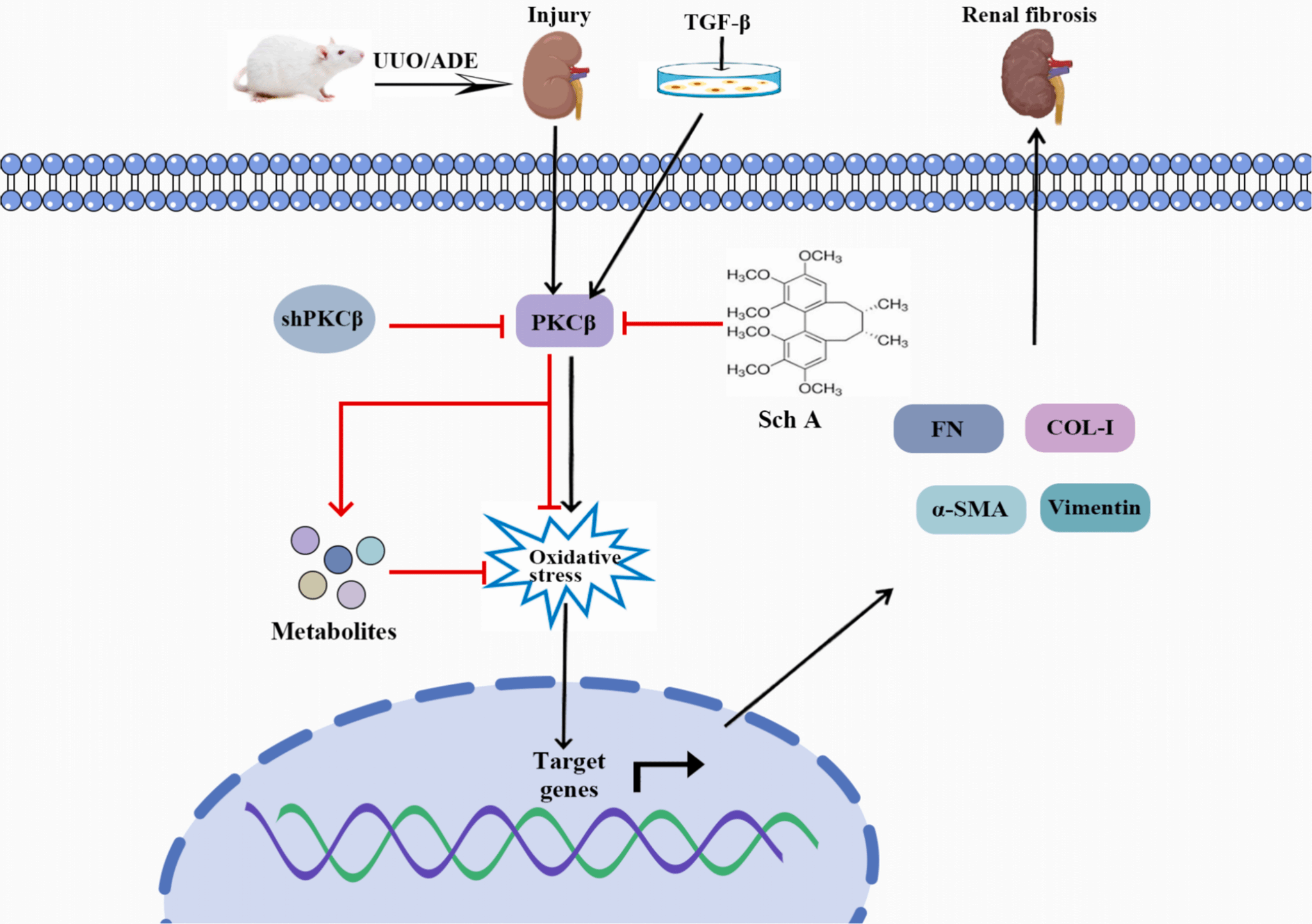 PKCβ是蛋白激酶C家族的一个成员,在癌症、阿尔茨海默病和糖尿病中起着重要调节作用。有研究表明,PKCβ特异性抑制剂可以改善UUO小鼠诱导的肾损伤。我们通过转录组学技术分析发现PKCβ在UUO小鼠肾脏组织显著上调。肾脏特异性敲低PKCβ显著改善了UUO和ADE模型诱导的肾脏纤维化并抑制氧化应激的水平。通过血清代谢组学技术发现敲低PKCβ可以上调潜在抗氧化代谢物1,5-AG、牛磺酸和β-羟基丙酮酸等的水平。我们发现中药五味子中的主要活性成分五味子甲素可以通过抑制PKCβ的表达和抑制氧化应激的水平从而改善UUO诱导的肾脏纤维化。并且,体外过表达PKCβ部分消除了五味子甲素的药理作用,表明PKCβ是五味子甲素抗肾纤维化和抗氧化作用的关键蛋白。该论文海南大学为第一单位,张之昊研究员为最后通讯作者。以上两篇工作均得到了国家自然科学基金,海南大学人才启动经费的支持。