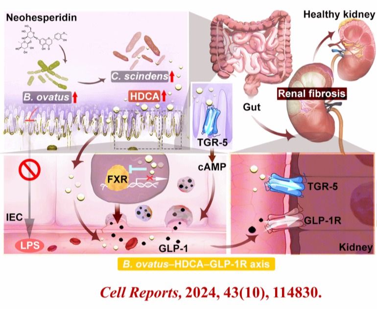 课题组首次发现小鼠定殖卵形拟杆菌(B.ovatus)后具有改善CKD和肾纤维化的作用。机制研究发现,B.ovatus能够促进肠道闪烁梭菌(C. scindens)的生长, 而C. scindens能够直接在肠道中产生活性内源性分子猪去氧胆酸(HDCA)。HDCA能够显著下调肠道FXR,上调肠道TGR5的蛋白表达,进而促进肠道L细胞分泌GLP-1。GLP-1通过血液循环到达肾脏激活GLP-1R发挥肾脏保护作用。此外,我们通过筛选发现天然产物新橙皮苷(NHP)通过促进B.ovatus的生长来发挥其抗肾纤维化作用。该论文海南大学为第一单位,张之昊研究员为最后通讯作者。