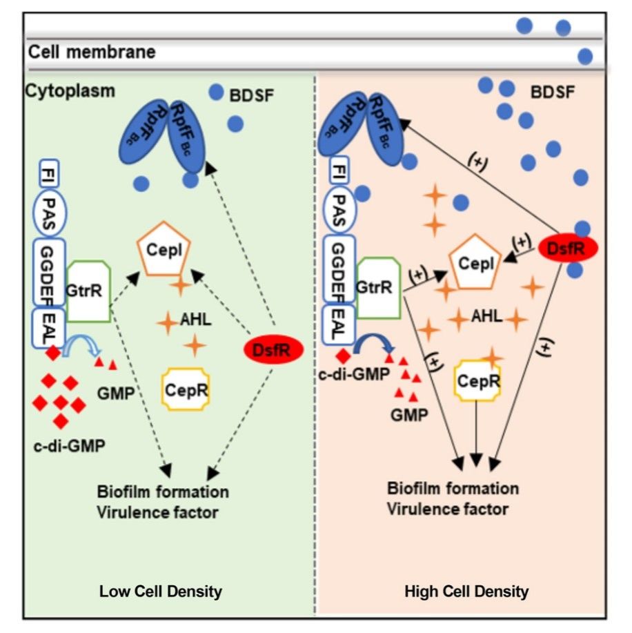 微生物通过细胞与细胞间信号交流,以促进它们适应不断变化的环境条件,这种细胞-细胞相互交流的机制被称为群体感应(Quorum sensing,QS),群体感应被广泛应用于病原菌调节生物学功能和致病毒力。洋葱伯克霍尔德菌(Bcc)是医院中一类重要的条件致病细菌,通常感染囊型肺纤维化(Cystic Fibrosis,CF)患者等免疫力低下的人群,其感染后常造成患者肺功能衰竭并伴有败血症,引起的临床症状被称为“洋葱伯克氏综合症”。洋葱伯克霍尔德菌主要通过以BDSF为信号分子的群体感应系统调控生物膜形成、运动性等表型和致病性。因此,鉴定新型病原细菌群体感应信号受体并解析其调控机制,对于阐明病原细菌的致病机制并开发新型抗菌药物起到重要推动作用。