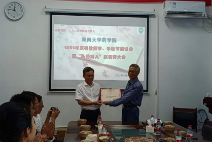 接着,胡静书记宣布并介绍本次获奖教师——王世范教授,并由学院罗海彬院长为其颁发药学院首位“弘药育人”奖荣誉证书。