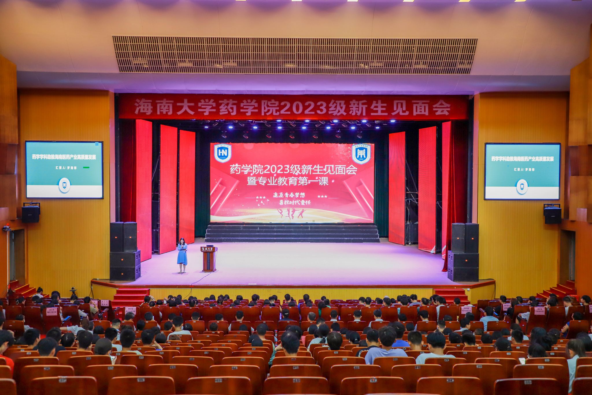 国歌声落下,药学院院长罗海彬院长上台讲话。他用温暖洪亮的声音代表学院欢迎新生的到来,语重心长地勉励大家要端正学习态度,努力学习,成为国家栋梁之材。罗海彬院长还为新生上了一堂别开生面的专业教育第一课。他指出,药学事业与国家富强、人民健康息息相关。在健康中国战略中,我国亟需大力发展药学事业,培养药学人才,以实现从药物“跟跑”向“并跑”乃至“领跑”的跨越。他勉励新生秉承“海纳百川、大道致远”的校训,在药学专业学习中勇攀高峰,成为医药产业发展所需要的高素质创新人才。