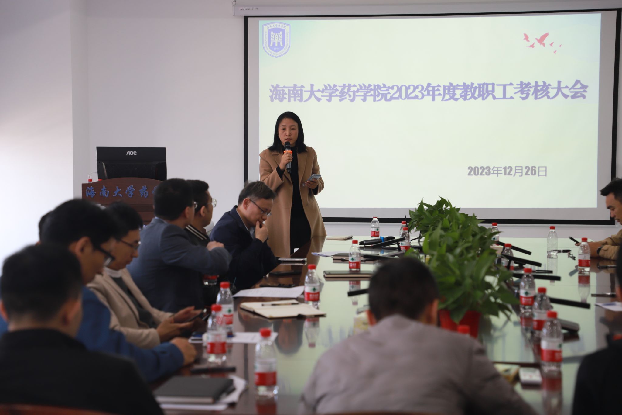 2023年12月26日上午,william威廉英国官网顺利召开2023年度教职工考核大会。会议在海口国家高新区美安产业孵化园william威廉英国官网515会议室举行,会议由学院党总支书记胡静主持,院长罗海彬、副院长宋彦廷、董帅、李宝力和药学院六十余名教职工参加。