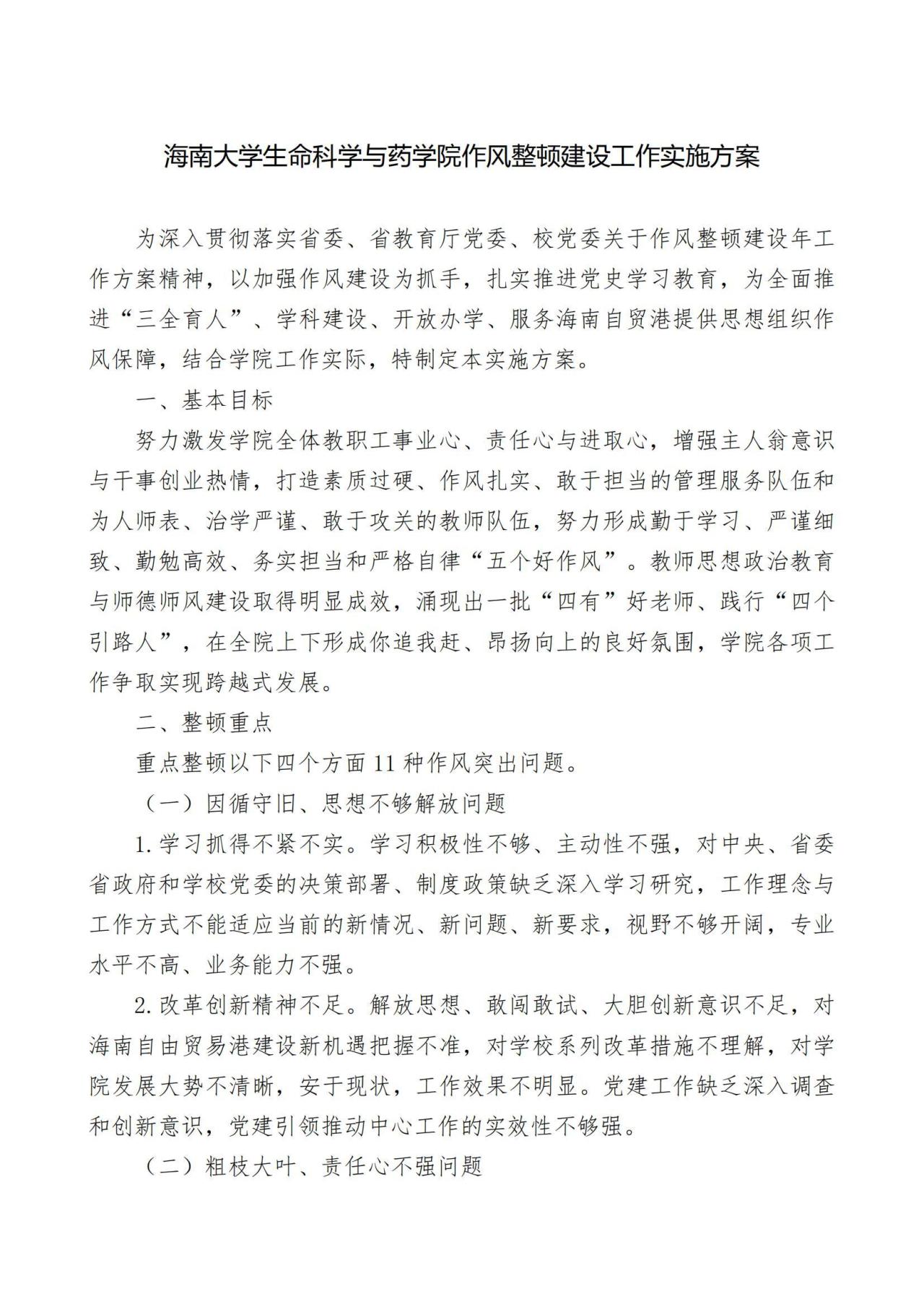 《海南大学生命科学与药学院作风整顿建设工作实施方案》(海大生药党〔2021〕14号)