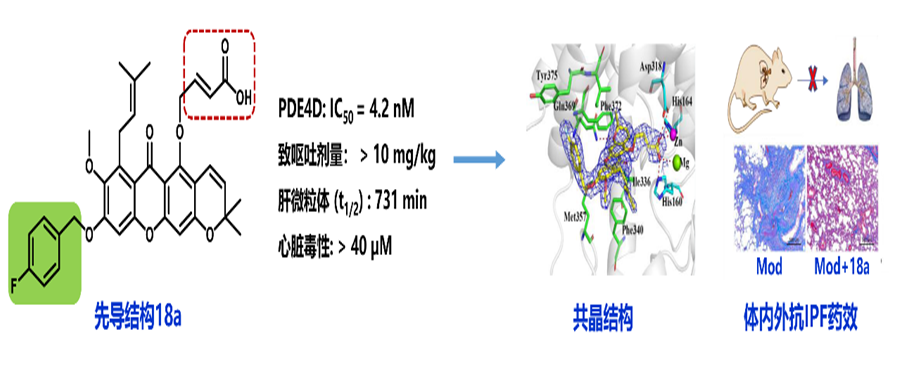 特发性肺纤维化(IPF)是一种病因不明的纤维化间质性肺病,目前尚无理想治疗药物。部分新冠病毒肺炎患者呈现较为严重的肺纤维化现象。磷酸二酯酶四型(PDE4)在纤维化的肺部组织中高度表达,是一个潜在的抗肺纤维化新靶标,但其抑制剂如上市药物罗氟司特等却因易引起严重的呕吐、腹泻等副作用而限制了其临床应用。因此如何发现高效低毒的PDE4抑制剂作为新型抗肺纤维化候选药物具有重要的意义。