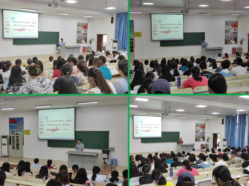 为了贯彻落实海南大学“六帮”工作,继续按三阶段就业工作模式助力全体本硕博毕业生顺利毕业、成功就业,2021年5月15日下午,两学院联合召开2021届毕业生大会(第三阶段)。生命科学学院党委书记曲涛、党委副书记韩胜丁、副院长韩谦、学工办主任武明明和药学院副院长宋彦廷、辅导员谢天宇以及本硕博200余名学生参加本次会议。