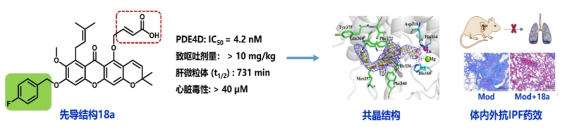 天然产物是寻找新颖骨架化合物的重要来源。药学院靶向药物设计与发现团队及其合作者在对天然产物倒捻子素进行优化后获得了先导结构18a,其是一个选择性高、活性强的PDE4抑制剂(IC50为4.2 nM),且具有高效低毒的优势(体内肺纤维化药效是阳性药物吡非尼酮的15倍,口服安全窗是阳性药物罗氟司特的10倍以上),表明先导结构18a具有开发为新型抗IPF候选药物的良好潜力(图3)。